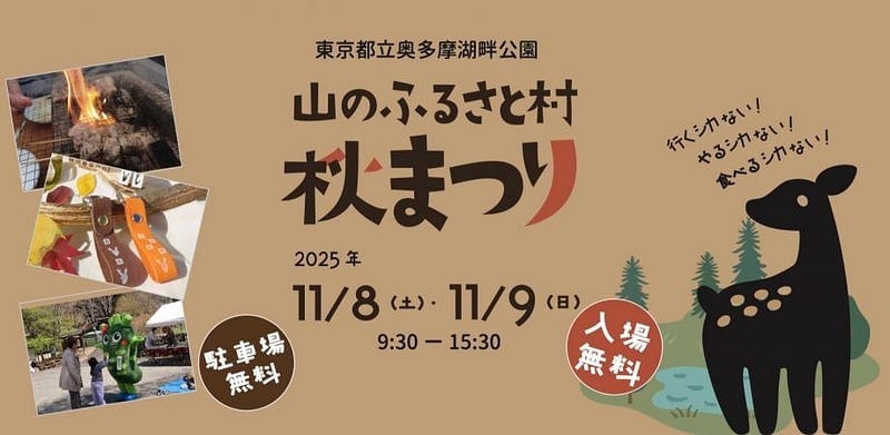 A free two-day autumn festival at Yama no Furusato Village, where visitors can explore Okutama’s nature, taste venison dishes, join workshops using deer antlers and leather, and enjoy local performances and crafts.