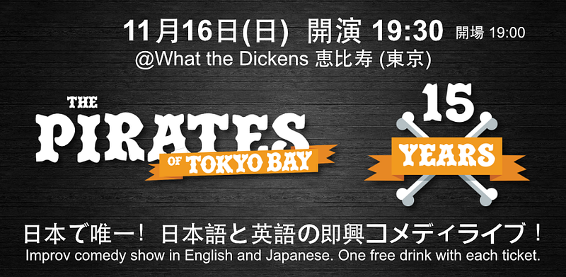 For more than a decade the Pirates of Tokyo Bay have been making audiences laugh in English and Japanese with our short-form improv comedy shows. Whatever language you speak, the Pirates of Tokyo Bay can make you laugh at our monthly show at What the Dickens in Ebisu.
