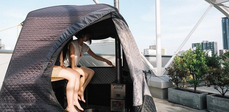 Rooftop Tent Sauna at Hotel Noum OSAKA — unwind in a “TERMA” tent sauna, cool off with a river breeze, and relax under the open sky.