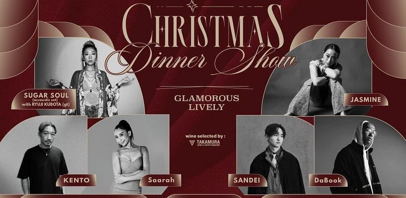 GLAMOROUS LIVELY Christmas Dinner Show featuring SUGAR SOUL and JASMINE. Live singing and DJ music in elegant atmosphere. Limited menu by French chef with 20 years experience. Wines selected by Takamura Wine & Coffee Roasters. 48 seats per day.