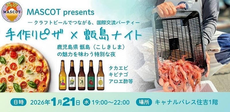 Experience the charm of Japan’s remote islands without leaving Tokyo. Enjoy Royal Red Prawn sashimi, handmade pizza, six varieties of craft beer from Koshiki Island Brewery, and other local specialties. Make new friends from Japan and abroad through hands-on pizza-making.