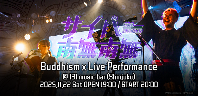 Experience “Buddhist Chant × Dance Music” — where spirituality meets technology. Cyber NamuNamu, known for fusing Buddhism and techno-art, will present a live performance at a music bar in Shinjuku.